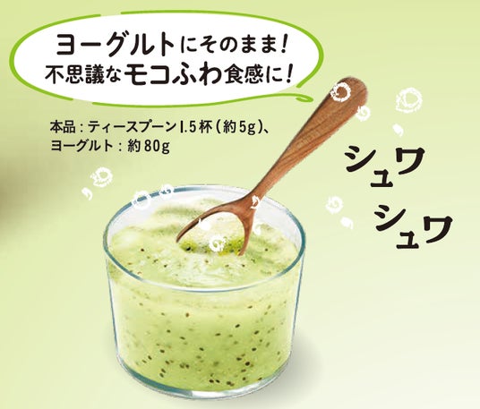 今回発売する「インスタント つぶつぶキウイ」は、チアシードを使うことでキウイのプチプチ感を再現。また、重曹を入れることでシュワシュワ感を加え、楽しい食感のドリンクデザートに仕上げました。粉末なので水に溶かしていただくのはもちろん、かけたり混ぜたりさまざまなアレンジをお楽しみいただけます。