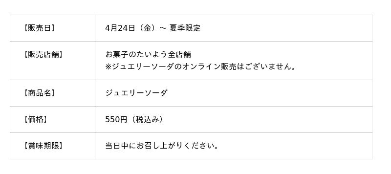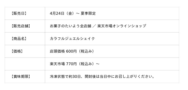 株式会社太陽社(所在地:千葉県匝瑳市飯倉293、代表取締役:片岡正裕)が展開する千葉県で長年愛される菓子店「お菓子のたいよう」は、春夏に連日完売する人気の“キラキラ宝石ゼリースイーツ”の待望の新作として、ブランド初となるデザートドリンク「カラフルジュエルシェイク」を、4月24日(金)より夏季限定で販売いたします。
