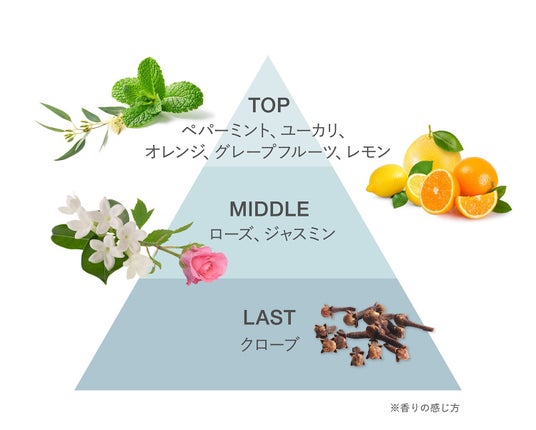 夏に心地よいフローズンミント&ペアーの香り。透明感のあるシンプルなミントが清涼感と爽快感を際立たせ、爽やかなシトラスノートと共にリフレッシュ。肌になじませていくと、ペアーの甘さが香ります。