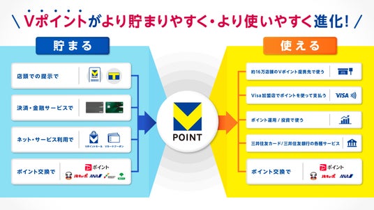 Vポイントマーケティングおよび三井住友カードは、ポイントと決済が融合した「Vポイント」がお客さまにとって親しみのある「みんなのポイント」となるよう、これからも多くのお客さまに喜んでいただけるサービスを提供してまいります。