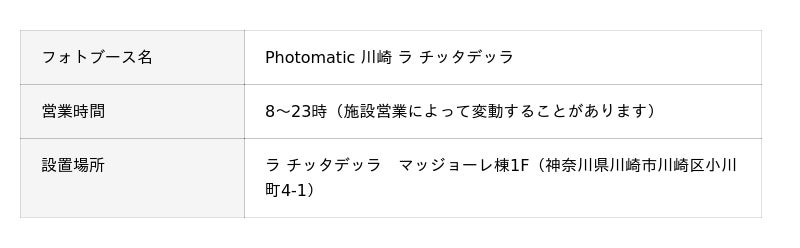キタムラ・ホールディングス グループの株式会社フォトクリエイト(本社:東京都新宿区、代表取締役社長:大迫 由典)が運営するセルフフォトブランド「Photomatic(読み:フォトマティック)」は、2026年4月21日(火)に神奈川県川崎市の複合商業施設「ラ チッタデッラ」内にセルフフォトブースを設置いたしました。