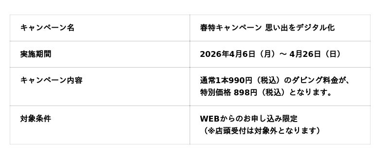 新生活が始まり、ご実家の整理や大掃除の機会が増えるこの季節に合わせ、大切な思い出の映像をより手軽にデジタル化していただくための特別キャンペーンを実施いたします。
