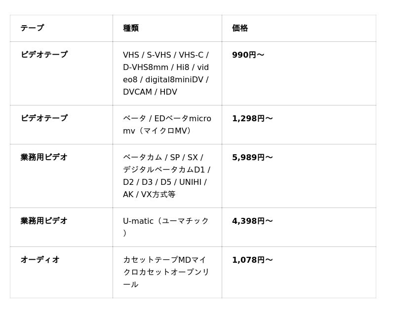 VHS・8mm・miniDV等のダビング料金は1本990円(税込)からです。