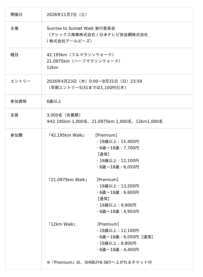 アシックス商事株式会社(兵庫県神戸市、代表取締役社長:小林 淳二)、日本テレビ放送網株式会社(東京都港区、代表取締役社長執行役員:福田 博之)、株式会社アールビーズ(東京都渋谷区、代表取締役社長:黒崎 悠)は、三社共同主催で東京都内を42.195km歩いて巡るウォーキングイベント「Sunrise to Sunset Walk」を2026年11月7日(土)に開催します。
