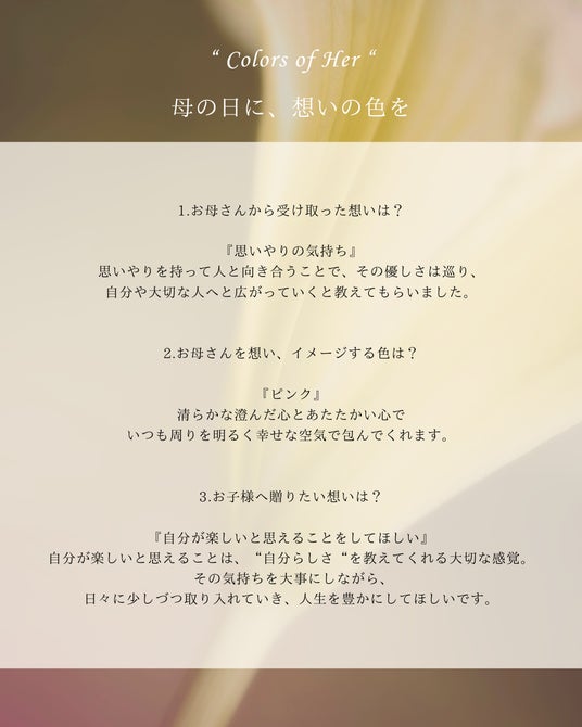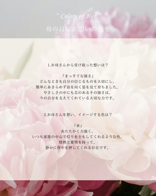 質問テーマは、あなたがお母さんから受け取った”想い”を教えて、お母さんをイメージした”色”はなんですか、自分の子供へ贈りたい想いはなんですか、などを予定。皆様の温かい言葉や気持ちに触れて、改めて大切な人を想うきっかけとなったら幸いです。
