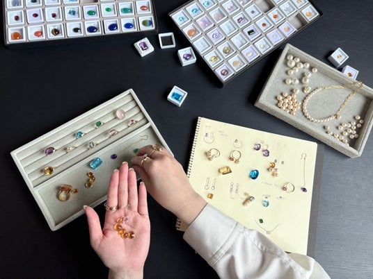 mi lunaで使用している天然石とパールはすべて、KOMEHYOで買い取ったものです。ディレクターが、コメ兵のプロの鑑定士が厳選した上質な宝石のなかから、生まれ変わる石をセレクト。一つ一つの個性やカットを見極めながら、その宝石本来の魅力を最大限に活かせるデザインをおこし、熟練した職人の丁寧な手仕事によって一点もののジュエリーとして新たに命を吹き込みます。