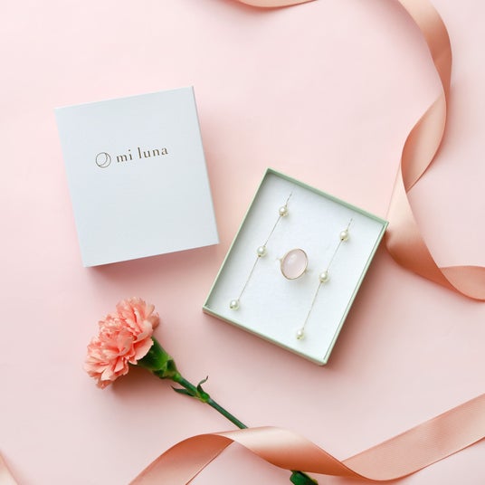 私たちの手に美しく輝くジュエリーの背景には、採掘における二酸化炭素の発生や環境破壊、低賃金労働など悲しい現実も潜んでいます。mi lunaは、新たに採掘をすることなく今この世で輝く天然石やパールを再利用。たとえば、近年、日本が世界に誇る「アコヤ真珠」の生産量が減少しています。貴重な資源を守るためにも、かつてブローチやネックレスに使われていた上質なアコヤパールを捨てるのではなく、再利用する。一度だれかのもとで役目を終えたジュエリーをアップサイクルすることで、サステナビリティを体現し、美しい未来の地球に貢献したいと考えています。実は、mi lunaの特徴である“リカットしない”ことも無駄を出さない取り組みの一つ。また、サステナブルブランドとして、リサイクル可能な紙素材を使用したジュエリーボックス、ヴィーガンレザーを使用したジュエリーポーチ、洗濯して何度も使えるジュエリークロスの販売なども行っています。