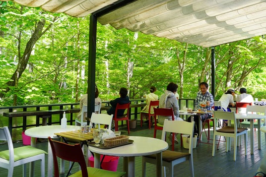 季節で移りゆく森の景色を眺めながら、室内席・テラス席でゆったりとお食事を楽しんでいただけます。ワンちゃん連れのお客様もテラス席をご利用可能です。おすすめは、何といっても創業以来の看板メニュー「フルーツティー」。一杯ごとに味わいが変わる、八ヶ岳倶楽部自慢の一品です。春の新メニューもご用意してお待ちしております。