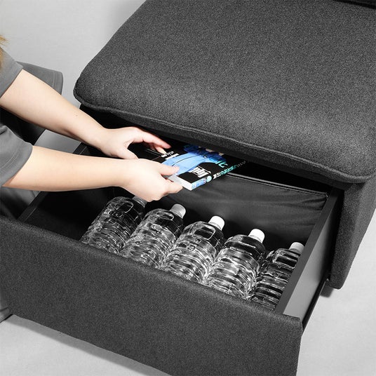 座面を引き出すと現れるのは、約51Lもの広大な隠しスペースです。かさばるデバイスの箱や、出しっぱなしになりがちな日用品を、生活感を隠してスマートに収納可能。内部には可動式の仕切りを搭載しており、収納するものに合わせて空間をカスタマイズ可能。手の届く位置にアイテムを配備しつつ、急な来客時にもサッと生活感を一掃できる設計です。