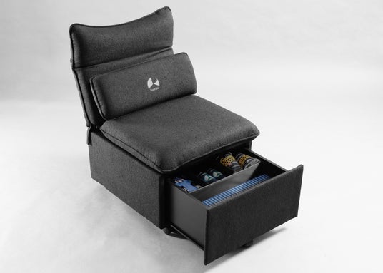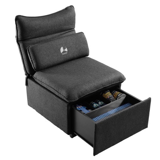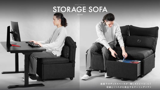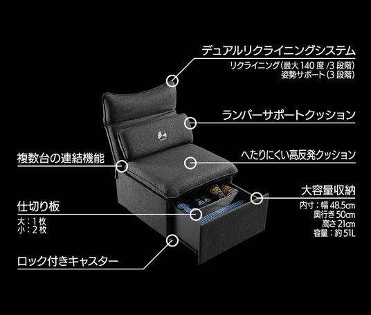 「収納場所を増やしたい、できれば立ち上がらずに手に取りたい!」この願いを叶えるべく、当ブランドはチェアの座面下に眠る広大なデッドスペースに着目。この未開の空間をまるごと「隠しストレージ」として活用できるソファ型チェアを開発しました。あらゆる必需品を座面下へ”封印”し、視界からノイズを消し去ることで、画面の中の世界へと心ゆくまで没頭できる、快適な自堕落環境作りをサポートします。
