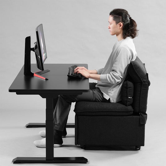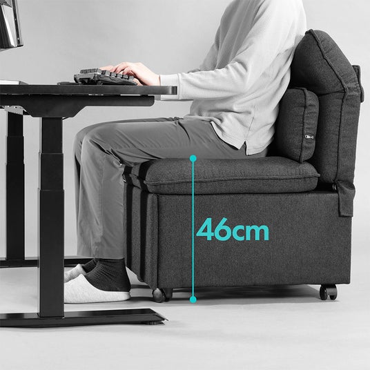 一般的なソファと比べやや高め(46cm)の座面設計かつ、お尻をしっかり支えて沈みすぎを防ぐ高反発クッションを採用。「デスクの高さに合わず、ソファでは作業がしにくい」という弱点を克服し、デスクでの使用を想定した設計にこだわっています。