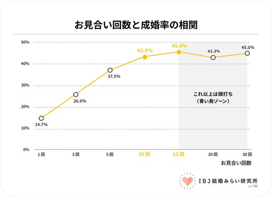 お見合い回数と成婚率の関係を分析したところ、お見合い回数が10~12回で成婚率がピークに達することが分かりました。それ以上お見合い回数を重ねても、成婚率は大きく上昇しません。