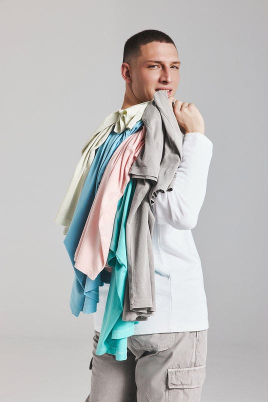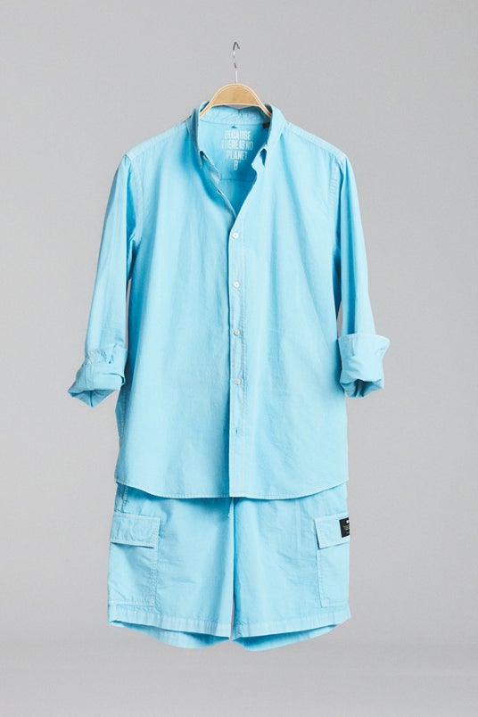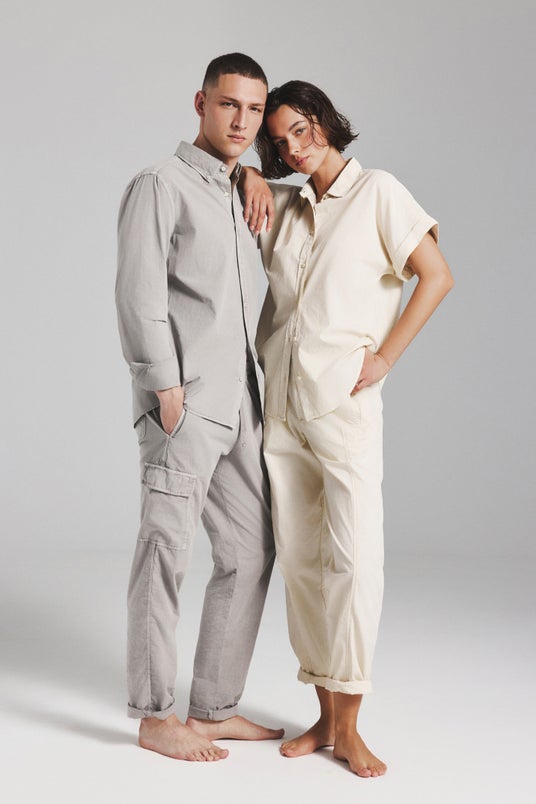 Tシャツなどのカットソーに加え、シャツ、パンツなどの布帛(織物)アイテムを含む計7型を日本で展開します。染色には自然由来の原料を使用し、ブルーやグリーン、ピンクなどの爽やかなカラーを取り揃えています。クリーンでシンプルなデザインを基調とし、素材そのものの風合いや、着用を重ねることで生まれる自然な変化も特徴です。