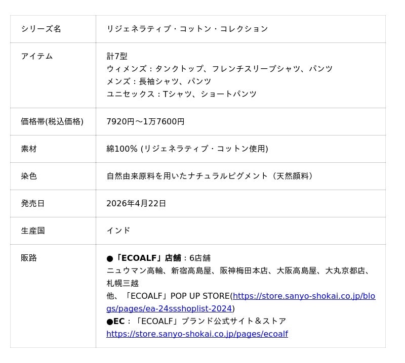三陽商会が展開するヨーロッパ発のサステナブルファッションブランド「ECOALF」(エコアルフ)は、再生型農業によって栽培されたリジェネラティブ・コットンを100%使用した「リジェネラティブ・コットン・コレクション」7型を、全国の「ECOALF」6店舗、及び「ECOALF」ブランド公式サイト&ストア等にて2026年4月22日に販売を開始しました。