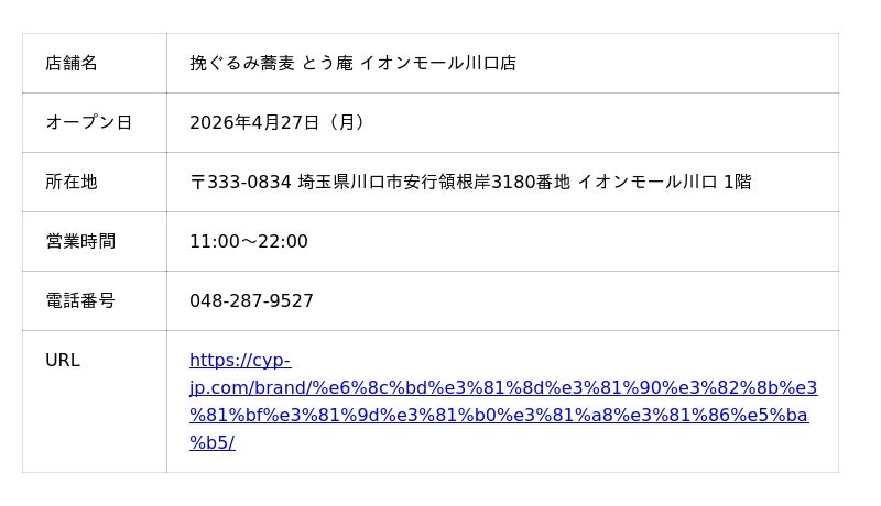 株式会社サイプレス(本社:東京都港区)は、2026年4月27日(月)、イオンモール川口内に新業態「挽ぐるみ蕎麦 とう庵 イオンモール川口店」をオープンいたします。国産蕎麦粉100%を使用した二八蕎麦を主役に、厚削りの本枯かつお節とさば節を重ねた出汁による江戸風のきりっとしたつゆ、あわせて楽しめる丼セットを揃え、商業施設の中でも日常的に立ち寄りやすい蕎麦専門店として展開します。