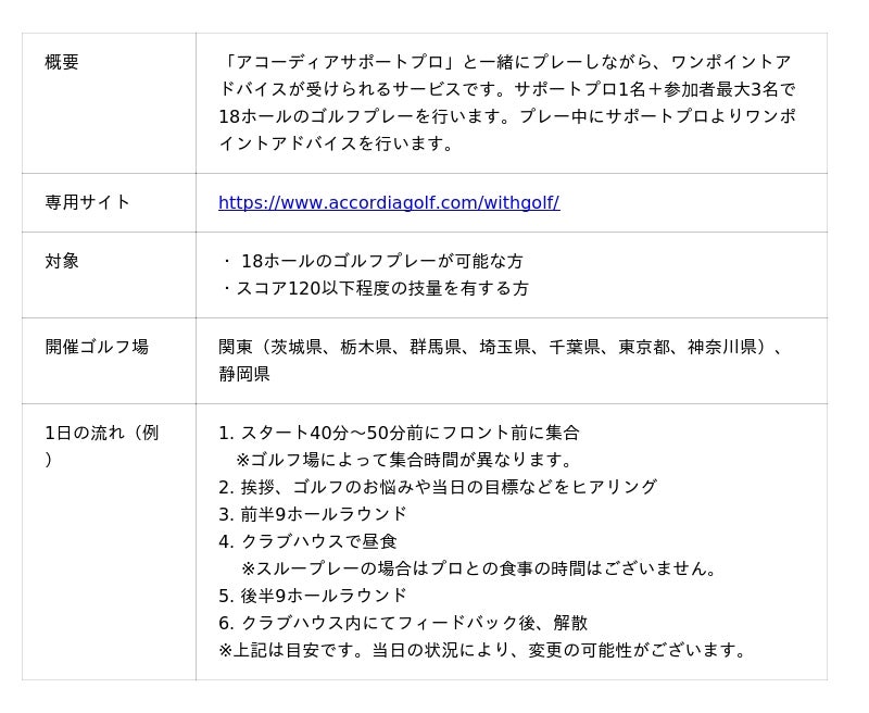 「withGolf」は、アコーディアサポートプロと一緒にプレーしながら、ワンポイントアドバイスが受けられるサービスです。サポートプロは、主に男女プロゴルフツアー本格参戦を目指す選手ならびにプロテスト合格を目指す選手であり、現在151名がアコーディアサポートプロとして登録しています。「withGolf」でのプレーは本格的なレッスンとは違い「ゴルフを楽しむ」ことを目的としており、昨年のサービス開始以降、多くのお客様より高い評価をいただいております。このたび、開催ゴルフ場を計49カ所に拡大し、より幅広いゴルファーの方々に「withGolf」をご利用いただける運びとなりました。今後も順次、全国へ展開していく予定です。