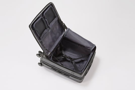 スーツケースを立てたまま荷物を出し入れできる、フロントポケット付きのスーツケースです。