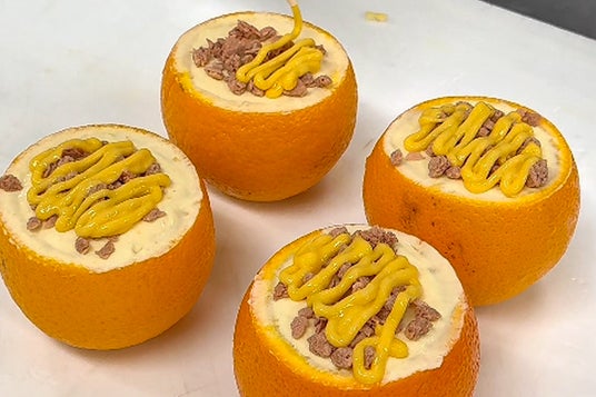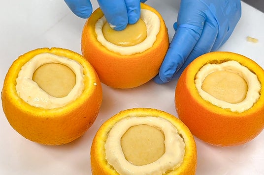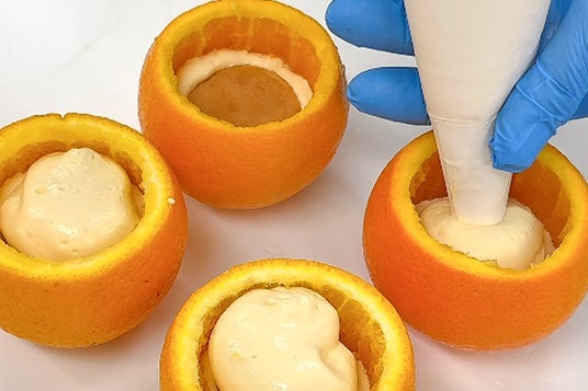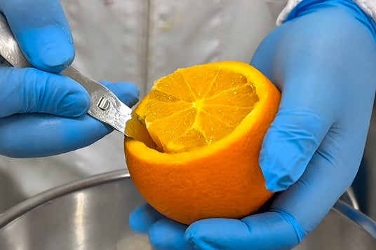 【1. オレンジ一玉を贅沢にくり抜く】まずは主役のバレンシアオレンジを丸ごと一玉、大胆にくり抜きます。この瞬間、溢れ出す果汁の量がとにかく凄い!このフレッシュな果汁がすべてのパーツの命になります。