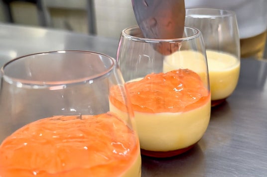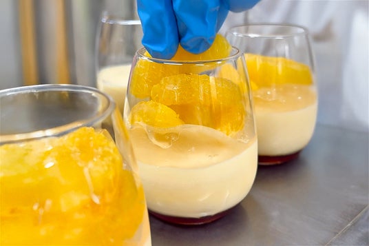 【3. 溢れる果汁感!とろけるジュレ】次に重ねるのは、口どけなめらかなオレンジジュレ。さっぱりとした爽快感が、濃厚なババロアのコクと重なり、最高の相性を生み出します。濃厚な層のあとに訪れるこの瑞々しさが、お口の中をリセットし、次の一口をさらに待ち遠しくさせてくれます。