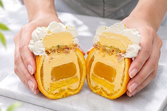 一般的なオレンジスイーツは「果汁」や「ピューレ」だけを使うことが多い中、このケーキは果肉・果汁・皮の香りまで、“丸ごと”味わい尽くせる“フルーツそのもの設計”。一つのオレンジから搾り尽くした果汁で、メインのババロアとジュレを仕立てました。さらに、皮のほろ苦さをしっかりと効かせたビターソースを忍ばせています。