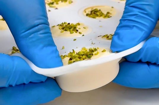 【5. 鮮やかなフィニッシュ!ピスタチオとババロアの共演】トップには、色鮮やかなピスタチオと、自慢のオレンジババロアをデコレーション。ピスタチオの香ばしさがオレンジの華やかさを引き立て、スプーンですくった瞬間に心躍る、五感で楽しむ仕上がりに。