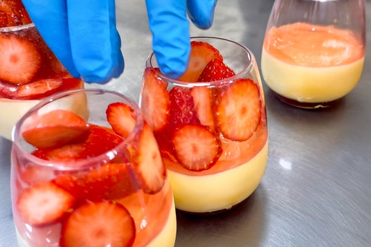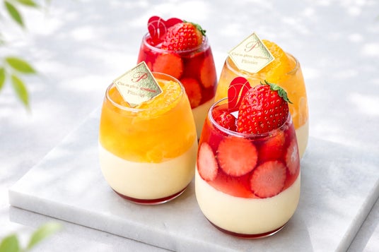 苺シロップで仕立てた香り高いゼリーの中に、真っ赤に熟れた果肉を隙間なくたっぷりと閉じ込めました。苺はあえて輪切りにカットすることで、断面からあふれる果汁とジューシーな果肉感が、ゼリーとの一体感を引き出しています。甘酸っぱい果汁と、バニラ香るプリンのまろやかなハーモニーは、まさに「贅沢の極み」です。