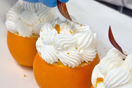 【6. 芳醇な純生クリームと、野生的なゼストの香り】仕上げに純生クリームを贅沢にたっっっぷり絞り、削りたてのオレンジゼスト(皮)を散らします。このゼストの突き抜けるような苦みと香りが、驚くほどの「オレンジ感」を演出。