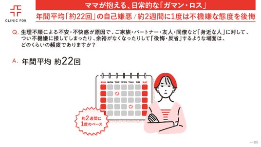 生理不順によるイライラや余裕不足が原因で、家族やパートナー、身近な人に不機嫌に接し「後悔・反省」する場面は、ママ1人あたり年間平均で約22回も発生していることが判明しました。