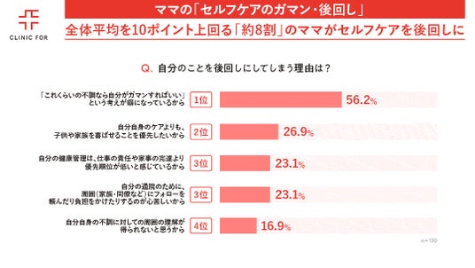 さらに、約80%ものママが自身の不調への対応を後回しにしており、その半数以上(56.2%)が「自分がガマンすればいい」という自己犠牲的な習慣の中にいます。
