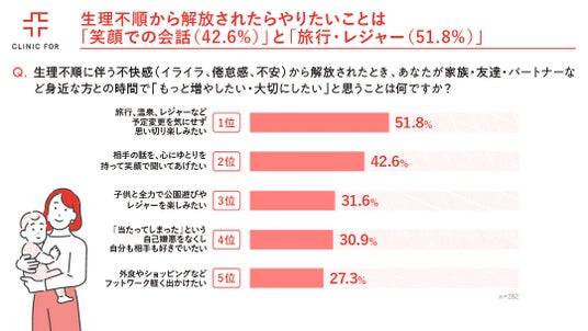 ・生理不順から解放されたらやりたいことは「笑顔での会話(42.6%)」と「旅行・レジャー(51.8%)」