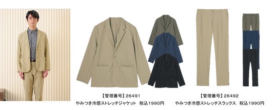 またメンズウェアからは、ビジネスからプライベートまでシーンを問わず万能に活躍する「冷感ストレッチシリーズ」のセットアップが登場しました。肌に触れた瞬間にひんやりと感じる接触冷感に加え、高い伸縮性とハリ感のある生地を採用。洗練されたテーラードジャケットのデザインながら、軽量で動きやすく、毎日袖を通したくなるような「やみつき」の着心地を実現しています。快適さと「きちんと見え」を両立した、日中は暑いのに朝晩は肌寒い今の時期におすすめのセットアップです。