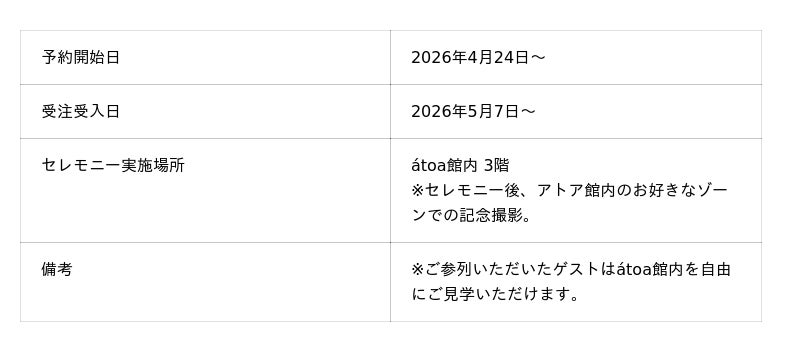 株式会社ラスイート(代表取締役社長 関 寛之、所在地:大阪市)では、アクアリウムとアートが融合した新感覚の都市型水族館「AQUARIUM×ART atoa」(館長:中山寛美、所在地:神戸市中央区)にて結婚式を行う、港KOBEウェディングセレモニープランを2026年4月24日より販売開始いたします。atoaでの幻想的なセレモニーの後は、神戸の海と街を一望できる、ラスイートルパンビル内「ラ・テラスホール神戸」での絶景と美食に包まれたパーティーとあわせて、特別なひとときをお過ごしいただける新たなウェディングスタイルをご提案いたします。