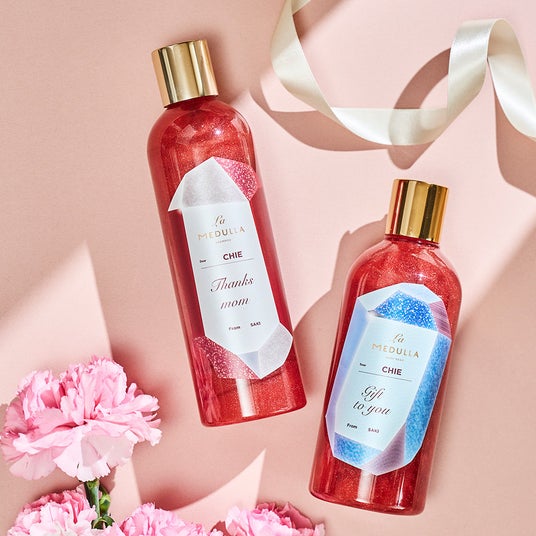 「La MEDULLA(ラ メデュラ)」シリーズでは、ボトルへの名入れに加え、メッセージを選択して印字することが可能です。「母の日」の感謝や、誕生日のお祝いなど、手紙のような温もりを添えられます。