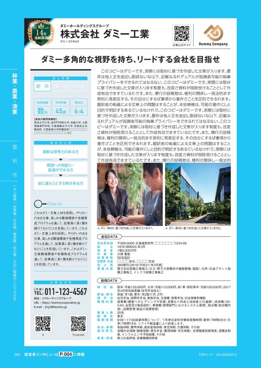エラベルは、地域の特徴ある企業を紹介する年刊の情報誌です(全10地域版)。TSR独自の企業分析法により、公正・中立の立場で優良企業を紹介。インタビュー記事や企業ランキング等、情報誌独自のコンテンツも多数掲載しています。学生さんは就職のための企業研究ツールとして、ビジネスマンは取引先開拓のための情報源としてご活用ください。