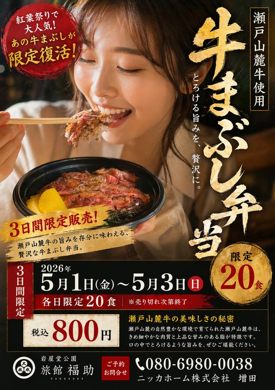 ニッカホーム株式会社は、愛知県瀬戸市の 岩屋堂公園 内にある 旅館福助 にて、2026年5月1日(金)から5月3日(日)までの3日間限定で、「瀬戸山麓牛」を使用した牛まぶし弁当を販売いたします。
