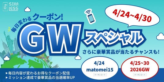 本キャンペーンでは、7日間(4月24日から4月30まで)日替わりでお得な割引クーポンを提供するほか、5月10日まで豪華賞品が当たるプレゼント企画を同時開催。さらに、期間中に設定されたミッションの達成数に応じて抽選の当選確率がアップする仕組みを導入し、ご利用いただくほど当選チャンスが広がる内容となっております。