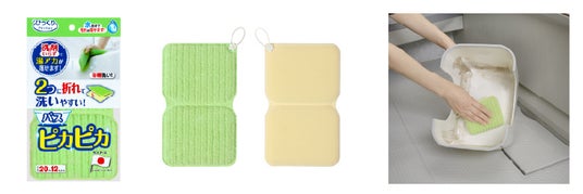 浴槽や壁、床の湯アカや石けんカスなどの汚れを落とせるお風呂掃除用品です。サンコー独自の特殊繊維「びっくりフレッシュ(R)」が汚れをしっかりからめ取り、洗剤を使用する場合も少量で掃除できるため、環境にもやさしいです。やわらかい素材で使い続けることで手になじみやすく、折り目入りで洗面器やイスの裏などもラクに掃除ができます。使用後はフックに掛けて乾かすことができます。