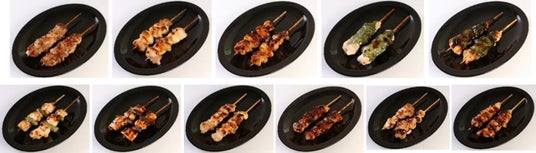 (左上から)ももスパイス、ももにんにく塩、ももにんにくタレ、むね大葉塩、むね大葉タレ(左下から)むねアスパラ塩、むねアスパラタレ、ぼんじり塩、ぼんじりタレ、ふりそで塩、ふりそでタレ ※商品の一例です。店舗により、取り扱い商品が異なります。