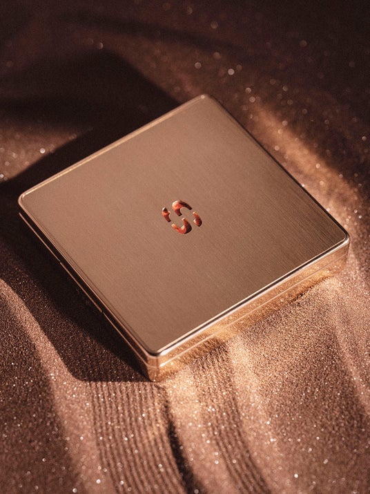 パウダー表面に施したブランドを象徴するオーキッド(蘭)のエンボスと、蓋の「S」ロゴが輝くマットゴールドのパッケージ。