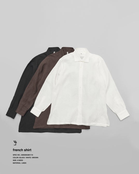 カラーはホワイト、ブラック、ブラウンの3色展開。リネン特有の光沢を抑え、落ち着いたトーンに仕上げました。サイズは9展開で、スリムには振らず、適度なゆとりを持たせています。