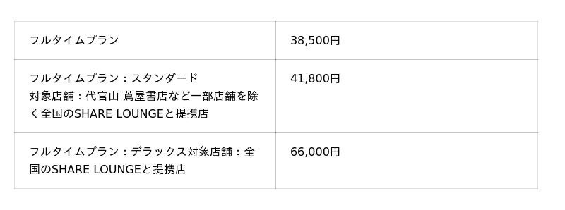 ●上記金額は税込金額です。●時間を超えた場合、自動で延長となります。●プレミアムメンバーは、初月は日割料金でご利用いただけます。●他拠点フルタイムスタンダードの対象外店舗については、公式HPをご確認ください。