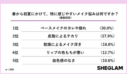 150以上の国と地域で展開するグローバルコスメブランド「SHEGLAM」は、10~30代の女性、計299人を対象に「春のメイク悩み調査」を実施いたしました。