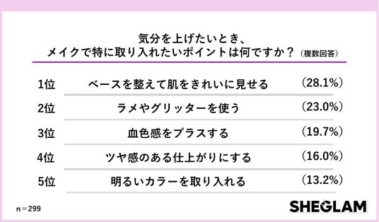「気分を上げたいとき、メイクで特に取り入れたいポイントは何ですか?」という質問では、1位「ベースを整えて肌をきれいに見せる」(28.1%)、2位「ラメやグリッターを使う」(23.0%)、3位「血色感をプラスする」(19.7%)、4位「ツヤ感のある仕上がりにする」(16.0%)、5位「明るいカラーを取り入れる」(13.2%)という結果に。
