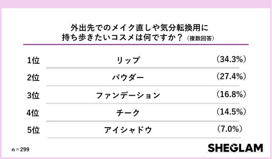 「外出先でのメイク直しや気分転換用に持ち歩きたいコスメは何ですか?」という質問では、1位「リップ」(34.3%)、2位「パウダー」(27.4%)、3位「ファンデーション」(16.8%)、4位「チーク」(14.5%)、5位「アイシャドウ」(7.0%)。