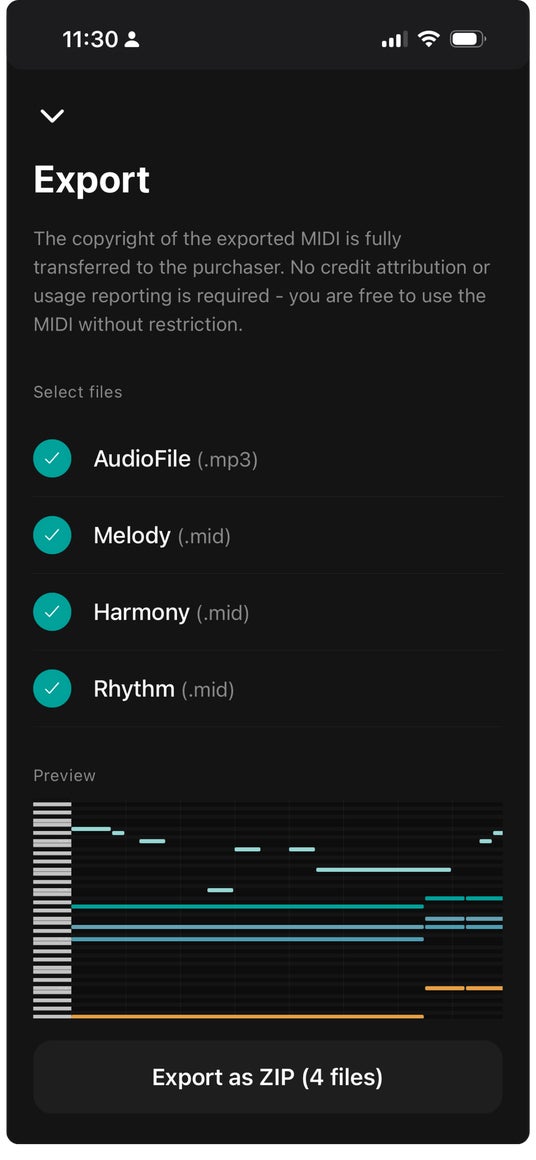 MusicTGAで生成したMIDI素材の著作権はユーザーに譲渡されます。商用・非商用を問わず利用できるため、配信、販売、SNS投稿、動画利用、コンペ応募、案件制作など、外部公開や商用利用を前提とした制作にも活用できます。AI音楽制作において、「生成できること」だけでなく、「安心して使えること」を重視した設計です。