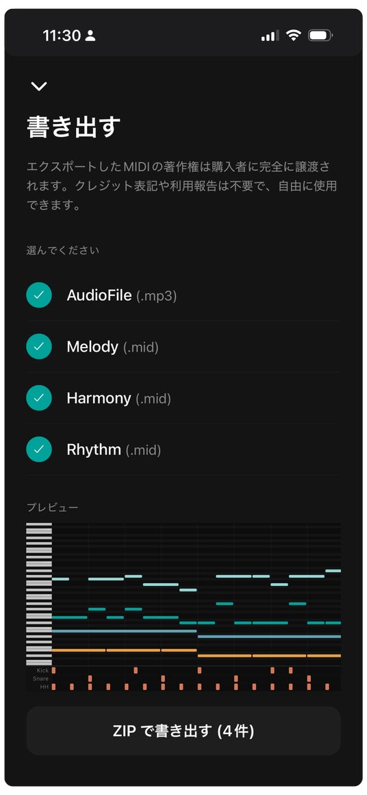 生成したMIDI素材の著作権はユーザーに譲渡され、商用・非商用を問わず利用可能です。配信、販売、SNS投稿、動画利用、コンペ応募、案件制作など、外部公開や商用利用を前提とした制作にも活用できます。
