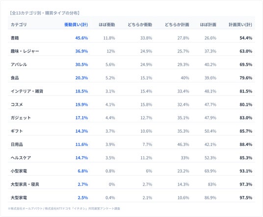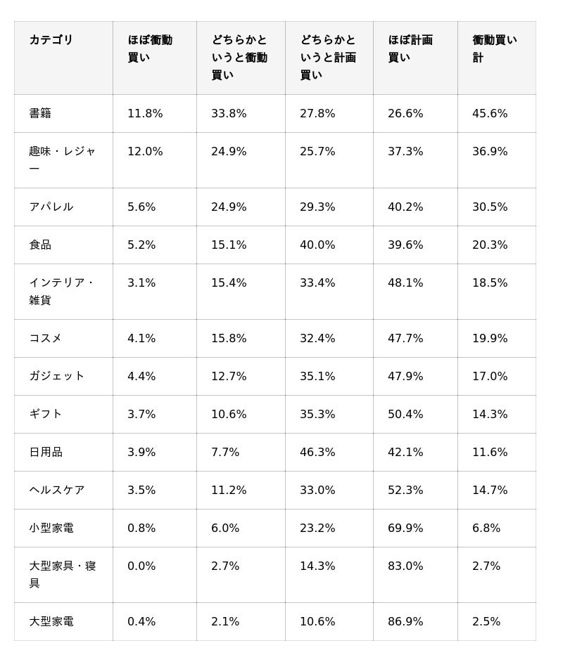 「書籍(衝動買い計45.6%)」や「趣味・レジャー(36.9%)」など、自分のテンションや知的好奇心を上げるカテゴリは、他と比較して衝動買いの割合が高くなっています。