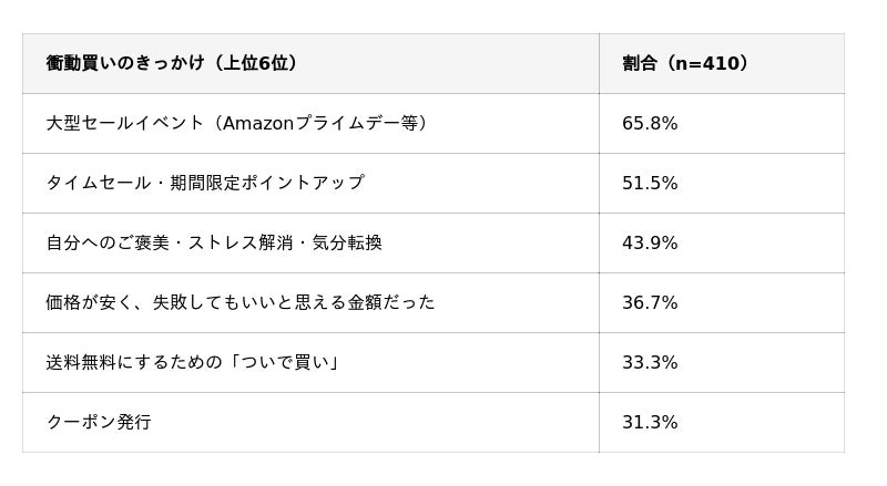 衝動買いをする層(410人)の約57%が、許容上限を「3,000円以下」に設定。さらに、その直感を誘発する最大のきっかけとして、「大型セールイベント(65.8%)」「タイムセール・期間限定ポイントアップ(51.5%)」「自分へのご褒美・ストレス解消(43.9%)」が上位を占めました。3,000円以下の絶妙な価格帯に、これらの誘惑が重なることで、本来予定になかったものを衝動買いしやすくなるネット通販特有の行動実態が浮き彫りになりました。