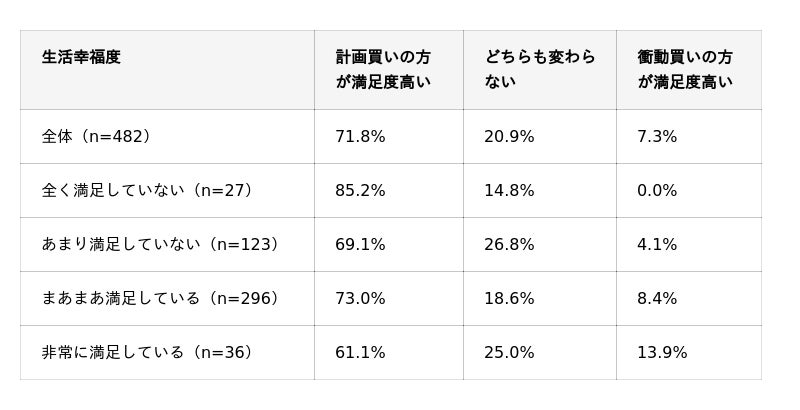 全体の約71.8%が「計画買いは満足度が高い」と回答。しかし、現在の生活幸福度が「非常に高い」層に限ると、衝動買いに満足感を見出す割合が全体の約1.9倍(13.9%)に跳ね上がる結果に。