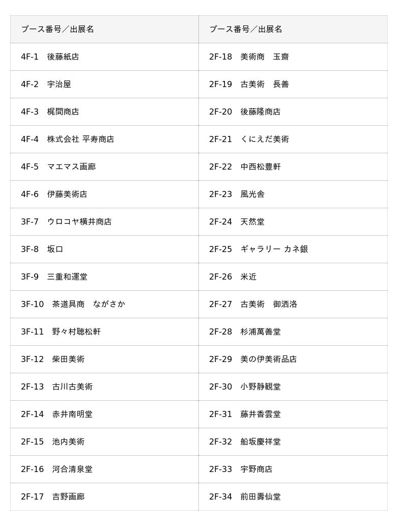 地元・名古屋、愛知をはじめ、東西から厳選された名店が一堂に会し、茶道具・書画・古美術から、当地ゆかりの現代作家の新作まで、例年以上に選び抜かれた作品・名品を展示販売いたします。